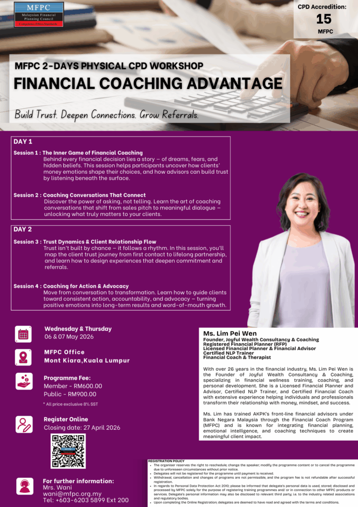You are cordially invited to attend the MFPC 2-Day Physical CPD Workshop: Financial Coaching Advantage to be held as follows :-