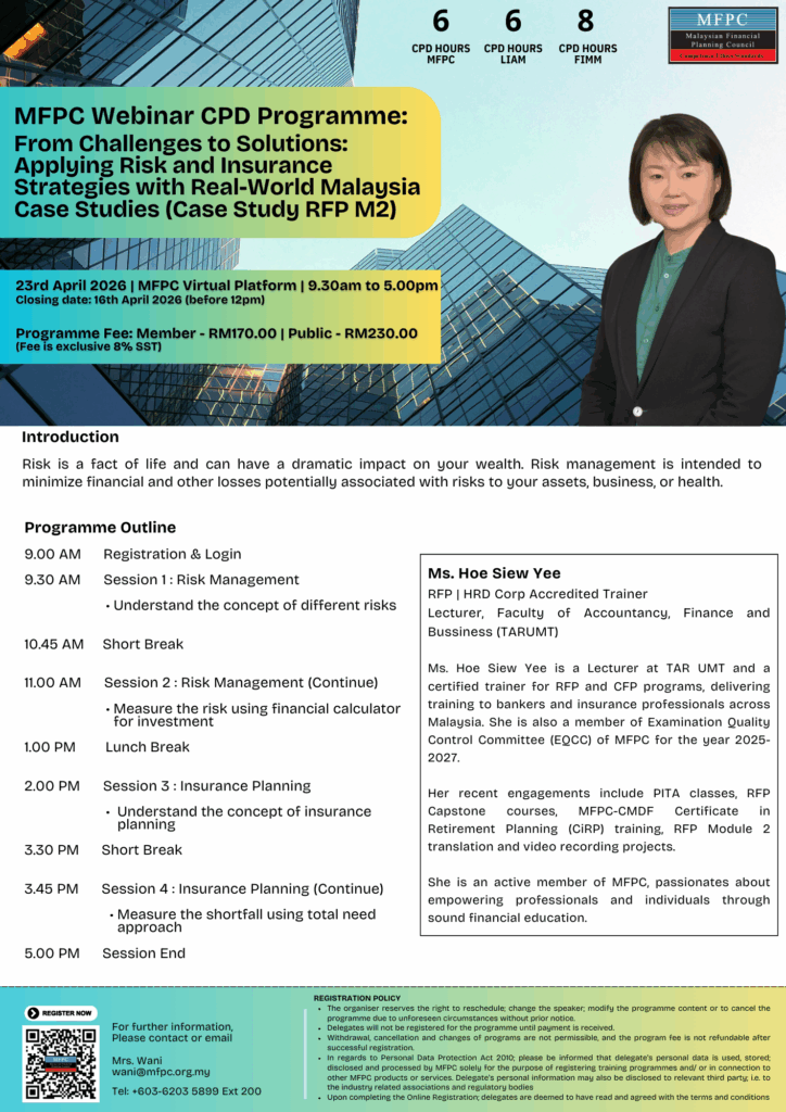 You are cordially invited to attend the MFPC Webinar CPD Programme: From Challenges to Solutions: Applying Risk and Insurance Strategies with Real-World Malaysia Case Studies (Case Study RFP M2) to be held as follows :-