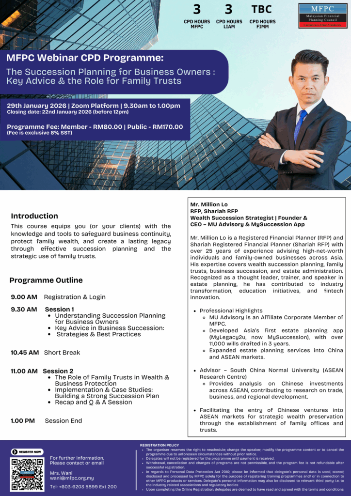 You are cordially invited to attend the MFPC Webinar CPD Programme: The Succession Planning for Business Owners : Key Advice & the Role for Family Trusts to be held as follows :-