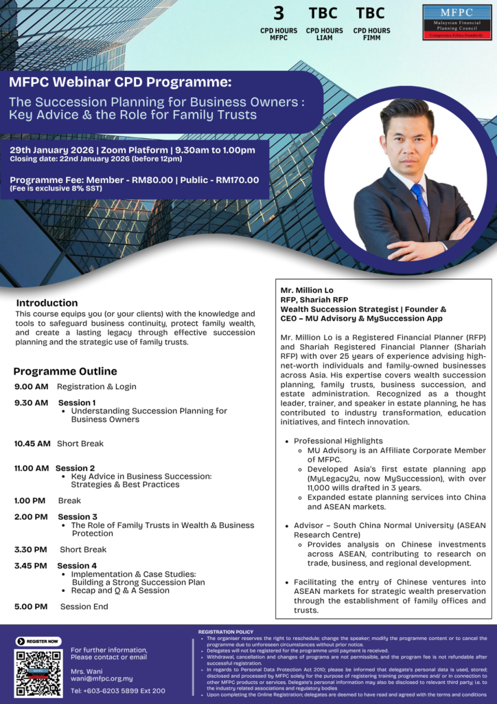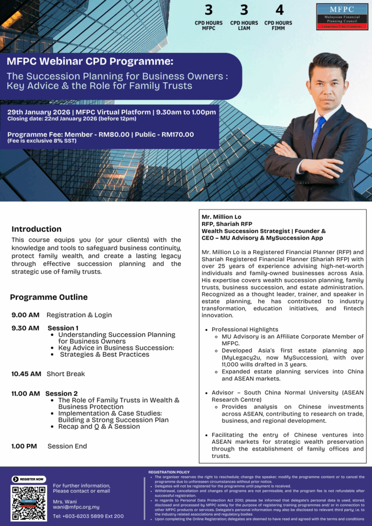 You are cordially invited to attend the MFPC Webinar CPD Programme: The Succession Planning for Business Owners : Key Advice & the Role for Family Trusts to be held as follows :-