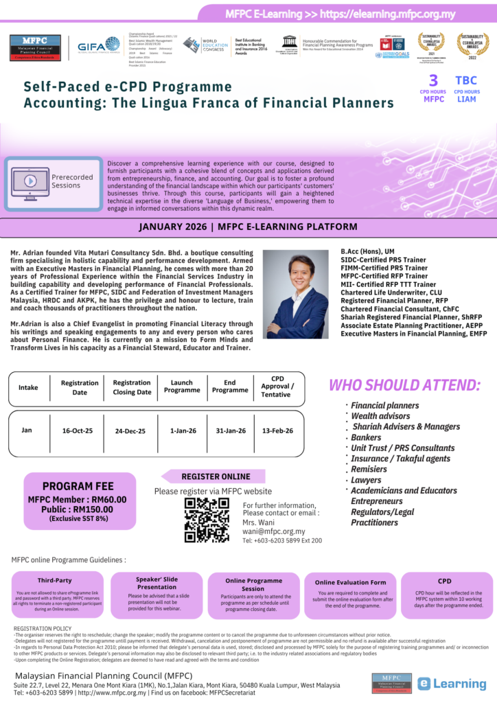 You are cordially invited to attend the MFPC Self-Paced e-CPD Programme Accounting: The Lingua Franca of Financial Planners to be held as follows :-
