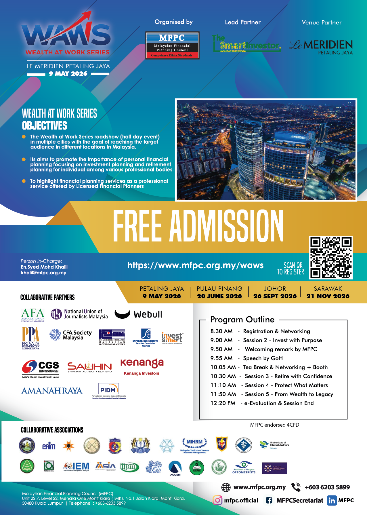 In accomplishing our mission to elevate the financial literacy of Malaysians including members of the Professional Bodies in Malaysia. We would love to share the opportunities with your organisation and its members from our new project called Wealth at Work Series (WAWS) Roadshow.