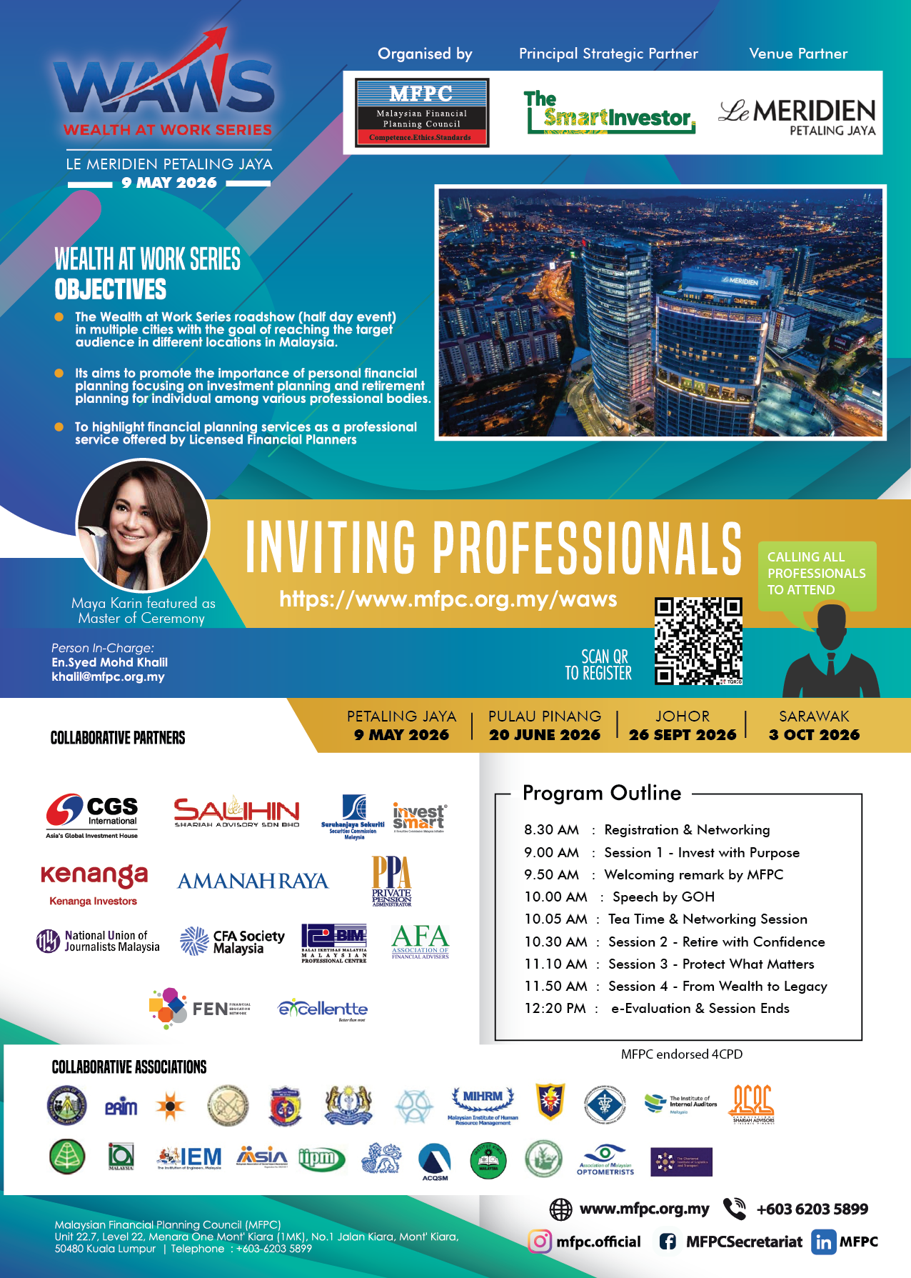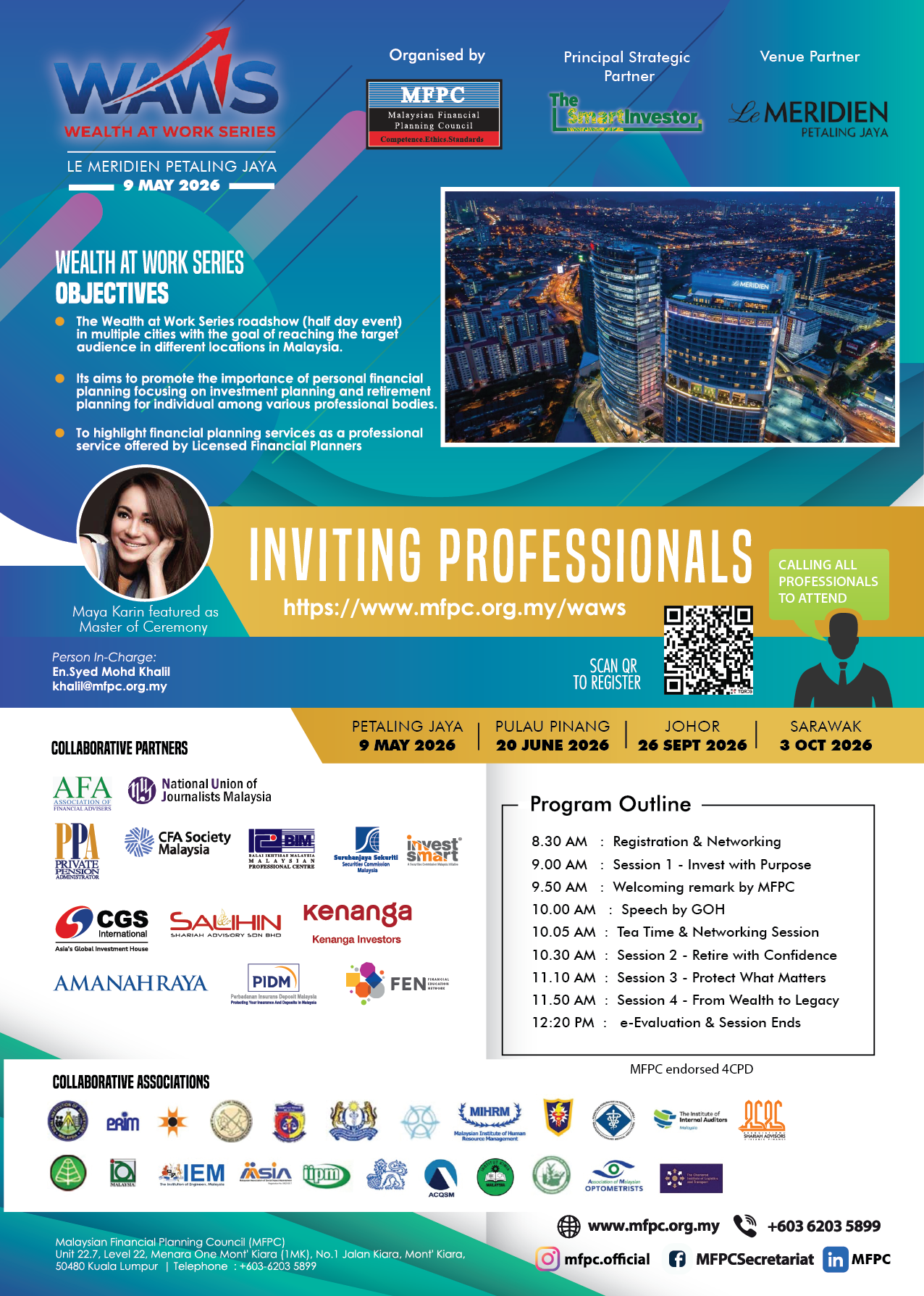 In accomplishing our mission to elevate the financial literacy of Malaysians including members of the Professional Bodies in Malaysia. We would love to share the opportunities with your organisation and its members from our new project called Wealth at Work Series (WAWS) Roadshow.